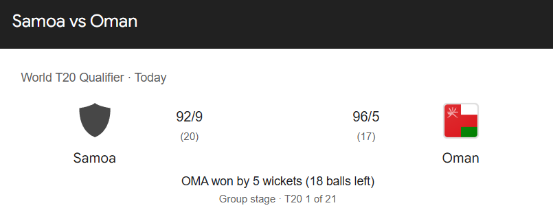 Oman Beat Samoa by 5 Wickets (ICC Men’s T20 World Cup Qualifier)