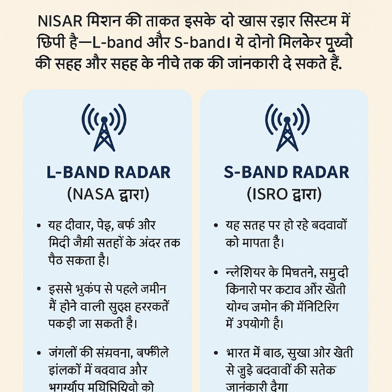 NISAR मिशन की ताकत इसके दो खास रडार सिस्टम में छिपी है—L-band और S-band। ये दोनों मिलकर पृथ्वी की सतह और सतह के नीचे तक की जानकारी दे सकते हैं।