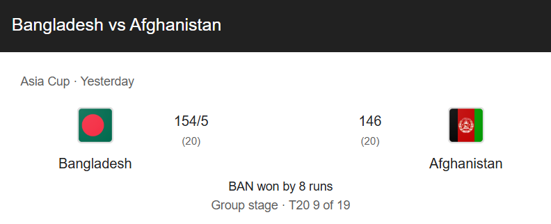 Bangladesh defeated Afghanistan by 8 runs in a thrilling match to keep their Super Four hopes alive. Their qualification now depends on the result of the Sri Lanka vs Afghanistan game.