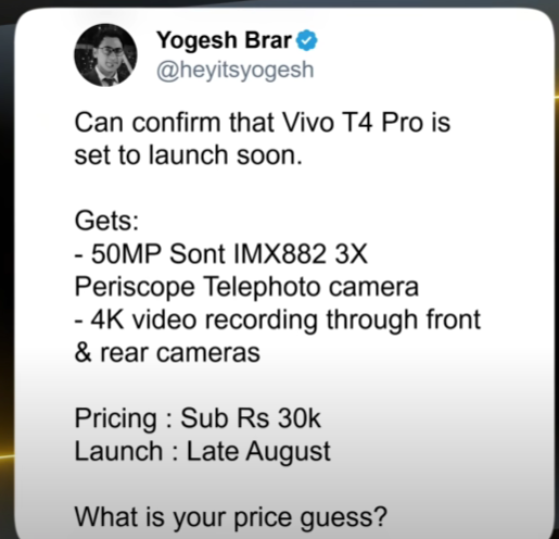 - Vivo T4 Pro: Launching end of August, with 3x periscope zoom and price under ₹30,000.