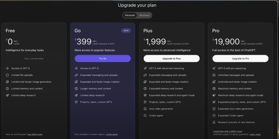 - OpenAI: Local pricing in India at ₹1,999/month for Plus plan.